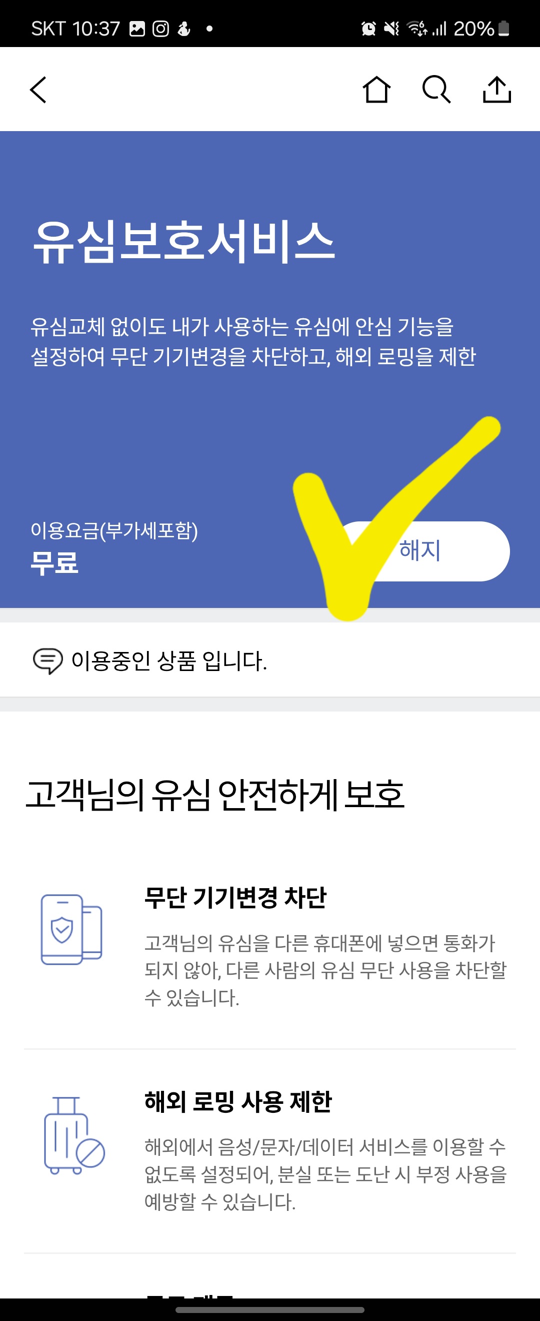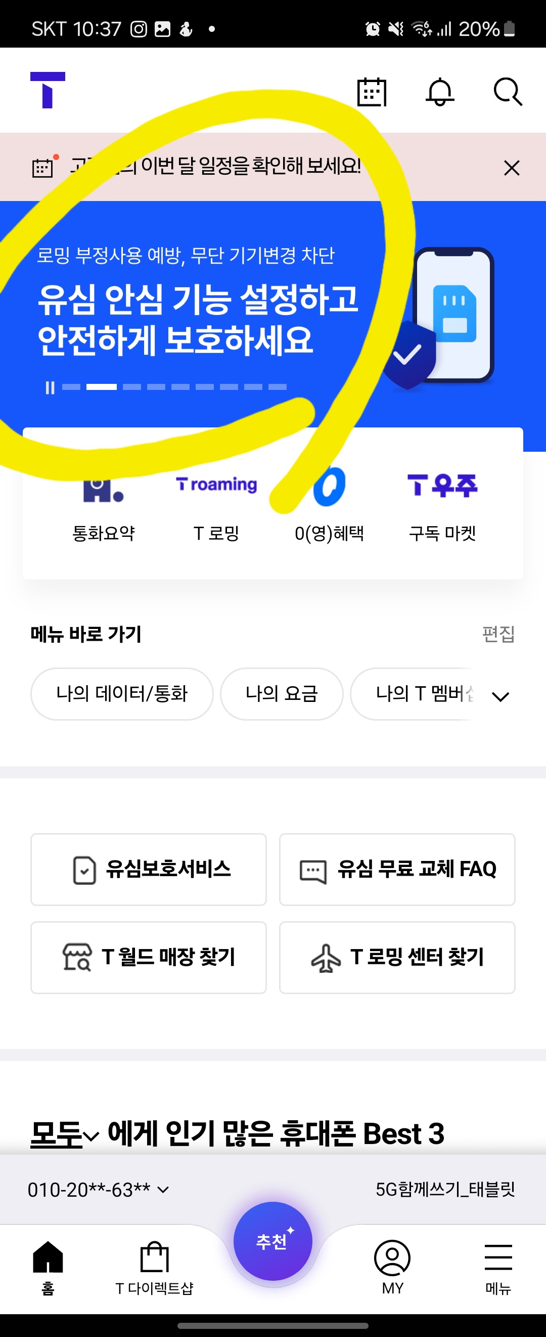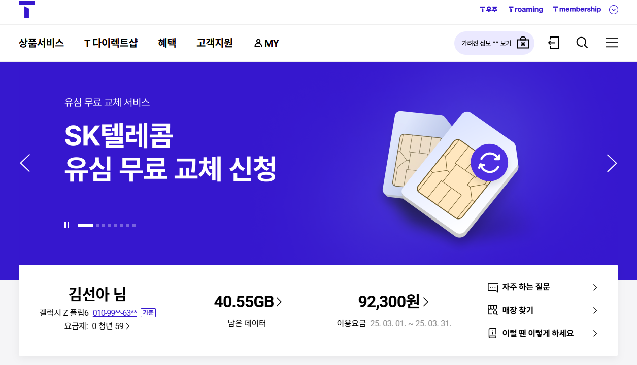 - T World ์ฑ์ ๋ค์ด๊ฐ์๋ฉด ๋ฉ์ธ๋ฐฐ๋์์ ์ ์ฌ๋ณดํธ์๋น์ค๋ฅผ ์ ์ฒญํ ์ ์๋๋ก ๋์ด์์ด์!
